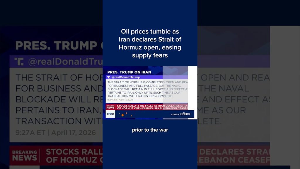 Latest News Oil prices tumble as Iran declares Strait of Hormuz open, easing supply fears 4 days ago Financial News Oil prices tumbled Friday after Iranian Foreign Minister Seyed Abbas Araghchi declared the Strait of Hormuz “completely open” during the ceasefire between Israel and Lebanon, raising hopes of easing supply disruptions. CNBC’s Pippa Stevens has the details. Post navigation Previous Confusion over the reopening of the Strait of Hormuz as Trump doubles down on U.S. blockadeNext ‘WHATEVER WE WANT’: Trump DROPS major update that lifts global markets
